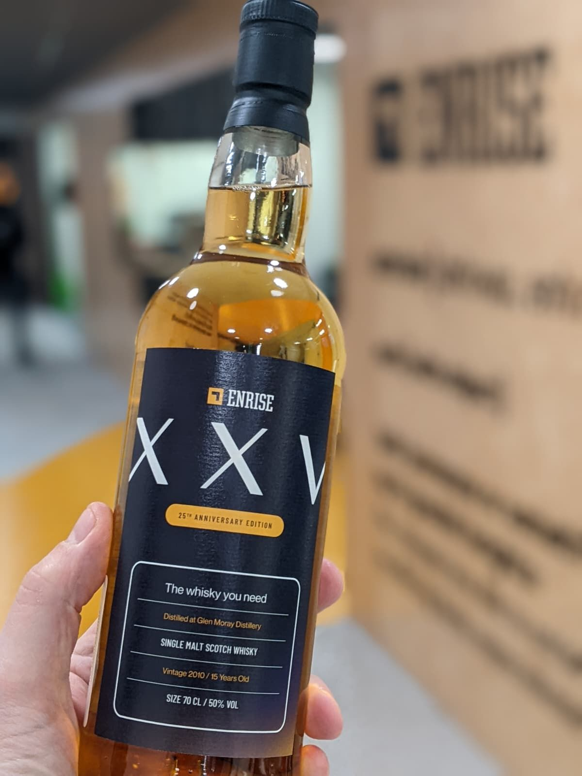 Bij Enrise geloven we dat bijzondere momenten om iets bijzonders vragen. Voor ons 25-jarig jubileum wilden we daarom iets creëren dat onze eigen reis weerspiegelt. Uniek. Ambachtelijk. Met aandacht gemaakt. Het resultaat is Enrise XXV. Een uitzonderlijke whisky speciaal voor ons gebotteld door de Glen Moray-distilleerderij in Elgin, Schotland. Met zijn 50 procent alcohol is Enrise XXV robuust en gelaagd. Een whisky die uitnodigt om rustig van te genieten.