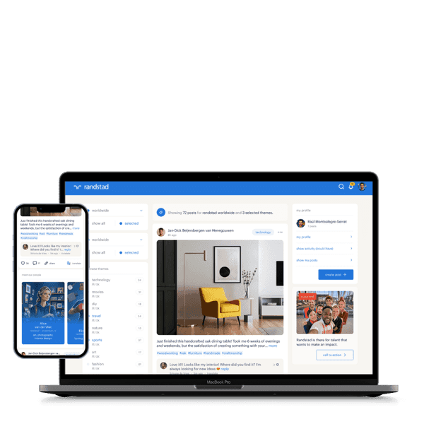 Enrise ontwikkelde een interactieve webapp waarin medewerkers content kunnen delen, reageren en nieuwe collega’s kunnen ontdekken. De app combineert sociale functies met inspirerende content rond talentontwikkeling, samenwerking en groei. Zo ontstaat een digitale plek waar mensen zich welkom voelen en waar Randstad-medewerkers van over de hele wereld elkaar vinden.